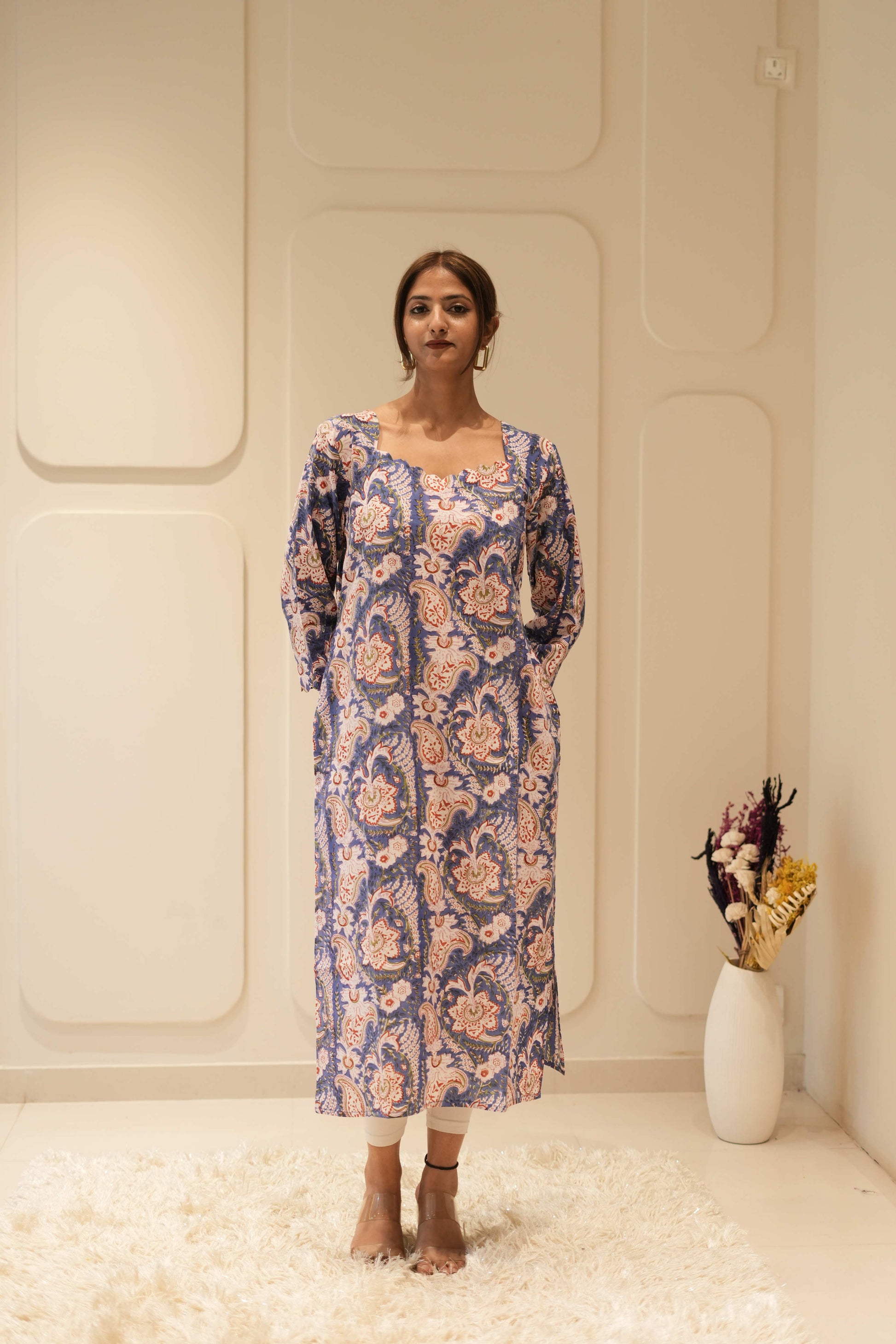 This indigo straight kurta features an intricate paisley and floral handblock-inspired print in soft ivory and rust tones. Crafted in a flattering straight silhouette, it is designed with a subtle scoop neckline and three-quarter sleeves, offering a balance of elegance and everyday comfort. The side slits enhance ease of movement while maintaining a refined structure.