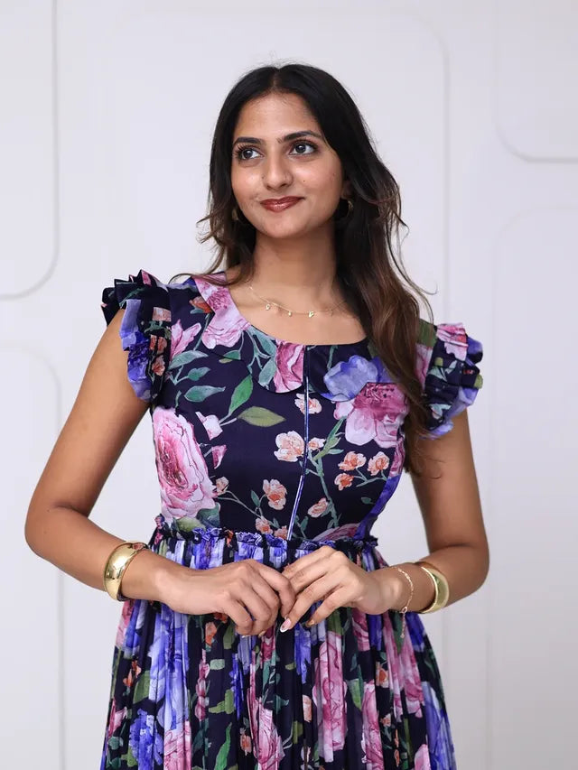 Elegant and effortlessly feminine, this midnight floral midi dress is designed to make a refined statement. Featuring soft ruffle sleeves and a gently fitted bodice, it flows into a gracefully pleated skirt that creates beautiful movement. The rich floral print against a deep backdrop adds depth and sophistication, making it perfect for brunch dates, evening outings, or special daytime occasions. Style it with minimal accessories and classic heels for a polished, timeless look.