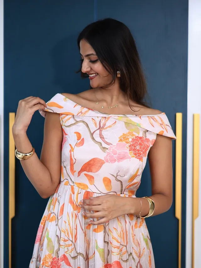 Bring effortless charm to your wardrobe with this off-shoulder floral midi dress, designed to create a soft and graceful statement. Featuring a beautifully draped neckline that highlights the shoulders and a flowing pleated skirt, this silhouette offers a perfect blend of femininity and comfort. The delicate floral pattern adds a fresh, artistic touch, making it ideal for brunches, daytime celebrations, or relaxed evening outings. Style it with minimal accessories and neutral footwear for a refined, polished look that feels both light and elegant.